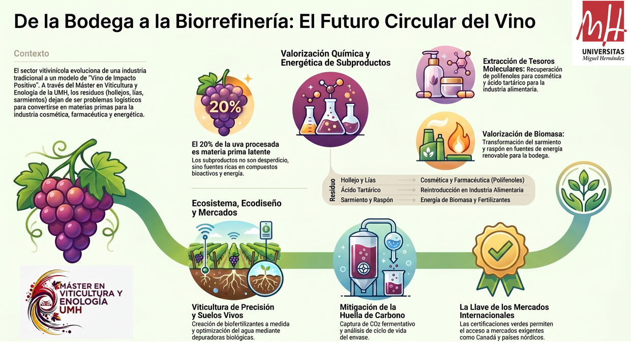 Para un graduado en ciencias, el residuo no existe; sólo existe la materia prima fuera de lugar. Mientras que la industria tradicional ve en el hollejo, el raspón y las lías un problema logístico, el Máster en Viticultura y Enología de la UMH te prepara para ver una oportunidad biotecnológica.